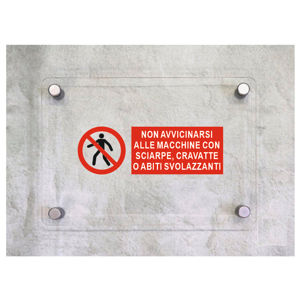 Global Targa Cartello in plexiglass UNI - NON AVVICINARSI ALLE MACCHINE CON SCIARPE, CRAVATTE - Con Distanziali in acciaio inox, Stampa UV