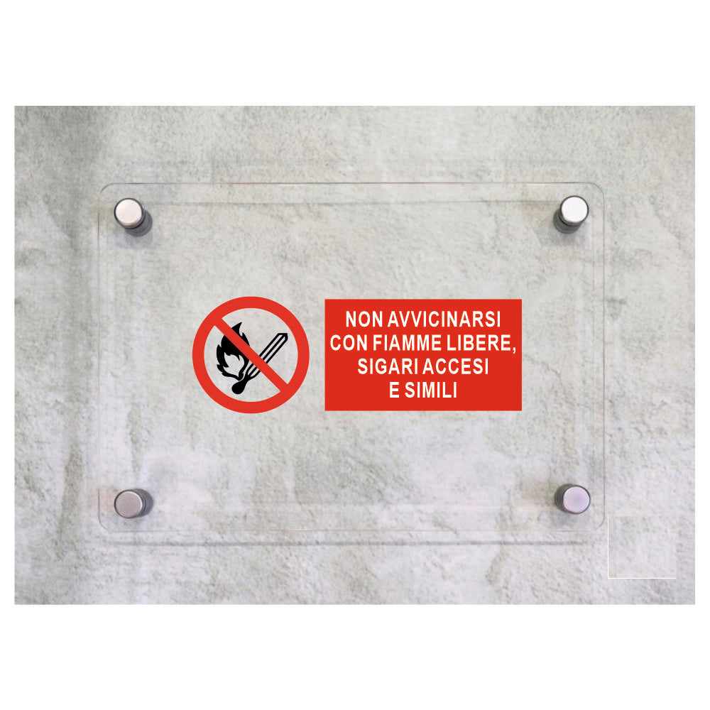 Global Targa Cartello in plexiglass UNI - NON AVVICINARSI CON FIAMME LIBERE SIGARI ACCESI orizzontale - Con Distanziali in acciaio inox, Stampa UV