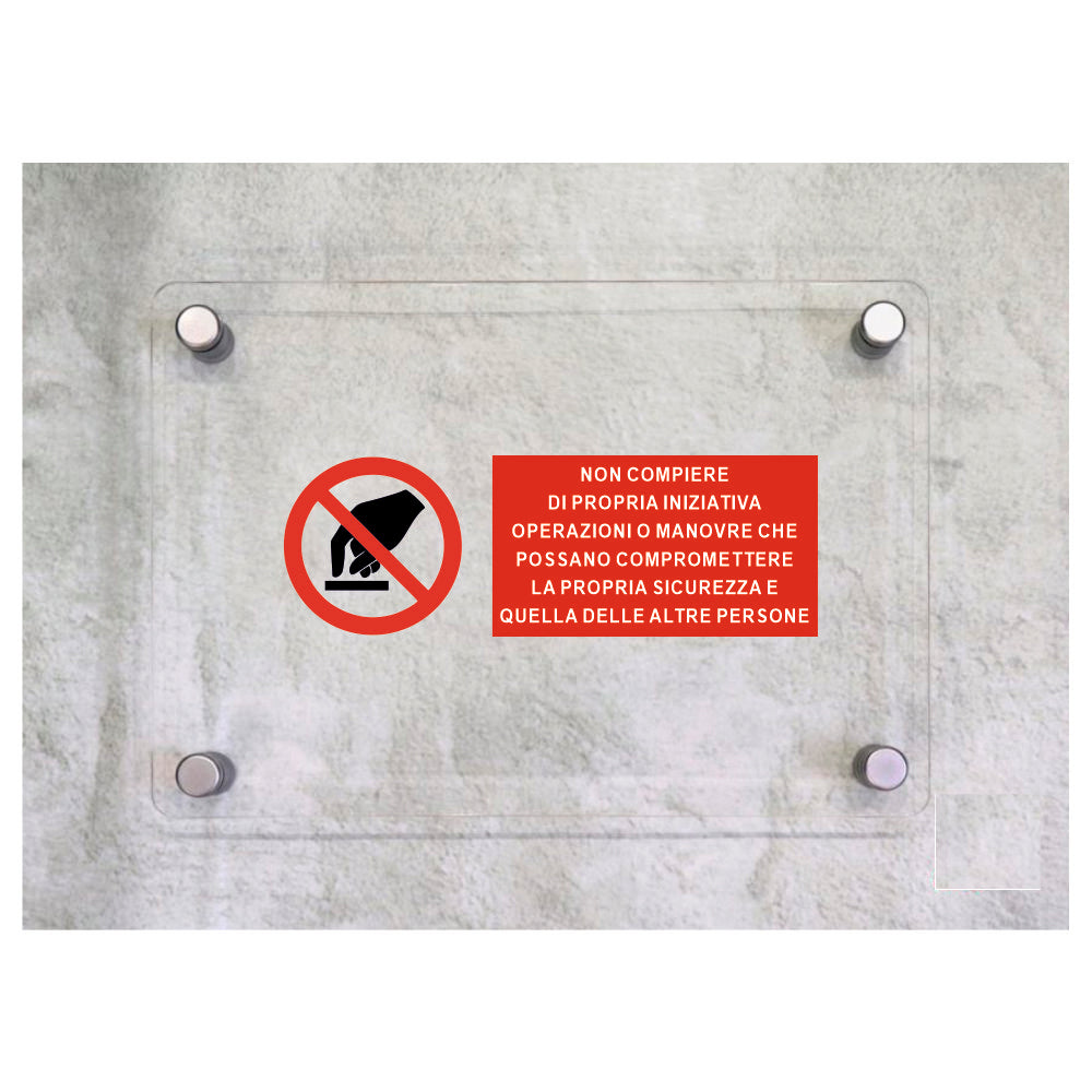 Global Targa Cartello in plexiglass UNI - NON COMPIERE DI PROPRIA INIZIATIVA OPERAZIONI OPERAZIONI O MANOVRE - Con Distanziali in acciaio inox, Stampa UV