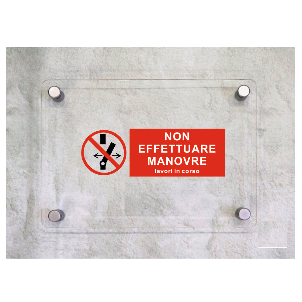 Global Targa Cartello in plexiglass UNI - NON EFFETTUARE MANOVRE LAVORI IN CORSO ORIZZONTALE - Con Distanziali in acciaio inox, Stampa UV