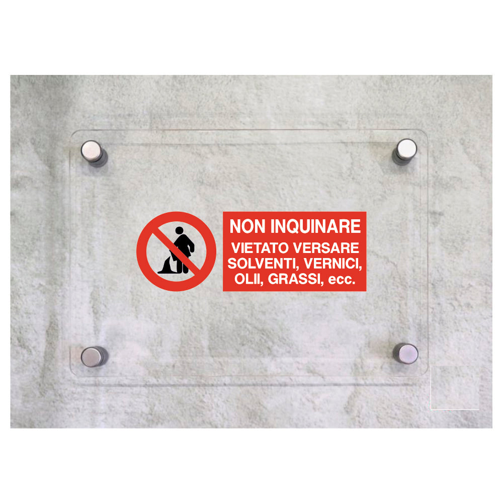 Global Targa Cartello in plexiglass UNI - NON INQUINARE VIETATO VERSARE SOLVENTI O VERNICI - Con Distanziali in acciaio inox, Stampa UV