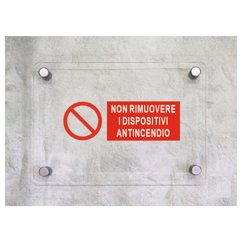 Global Targa Cartello in plexiglass UNI - NON RIMUOVERE I DISPOSITIVI ANTINCENDIO ORIZZONTALE - Con Distanziali in acciaio inox, Stampa UV
