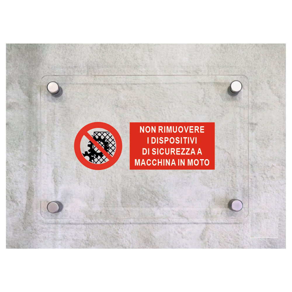 Global Targa Cartello in plexiglass UNI - NON RIMUOVERE I DISPOSITIVI DI SICUREZZA A MACCHINA IN MOTO - Con Distanziali in acciaio inox, Stampa UV