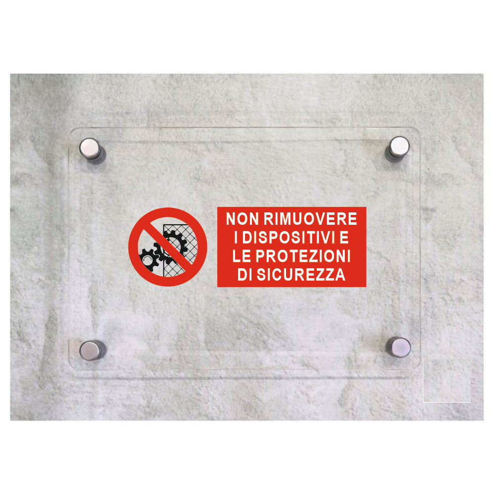 Global Targa Cartello in plexiglass UNI - NON RIMUOVERE I DISPOSITIVI E LE PROTEZIONI DI SICUREZZA ORIZZONTALE - Con Distanziali in acciaio inox, Stampa UV