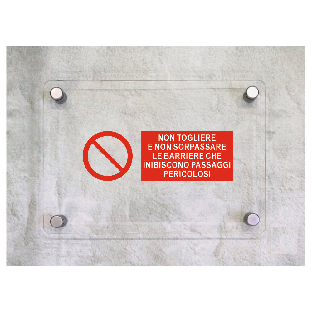 Global Targa Cartello in plexiglass UNI - NON TOGLIERE E NON SORPASSARE LE BARRIERE CHE INIBISCONO PASSAGGI PERICOLOSI ORIZZONTALE - Con Distanziali in acciaio inox, Stampa UV