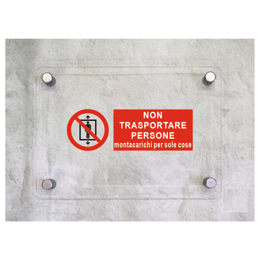 Global Targa Cartello in plexiglass UNI - NON TRASPORTARE PERSONE MONTACARICHI PER SOLE COSE ORIZZONTALE - Con Distanziali in acciaio inox, Stampa UV