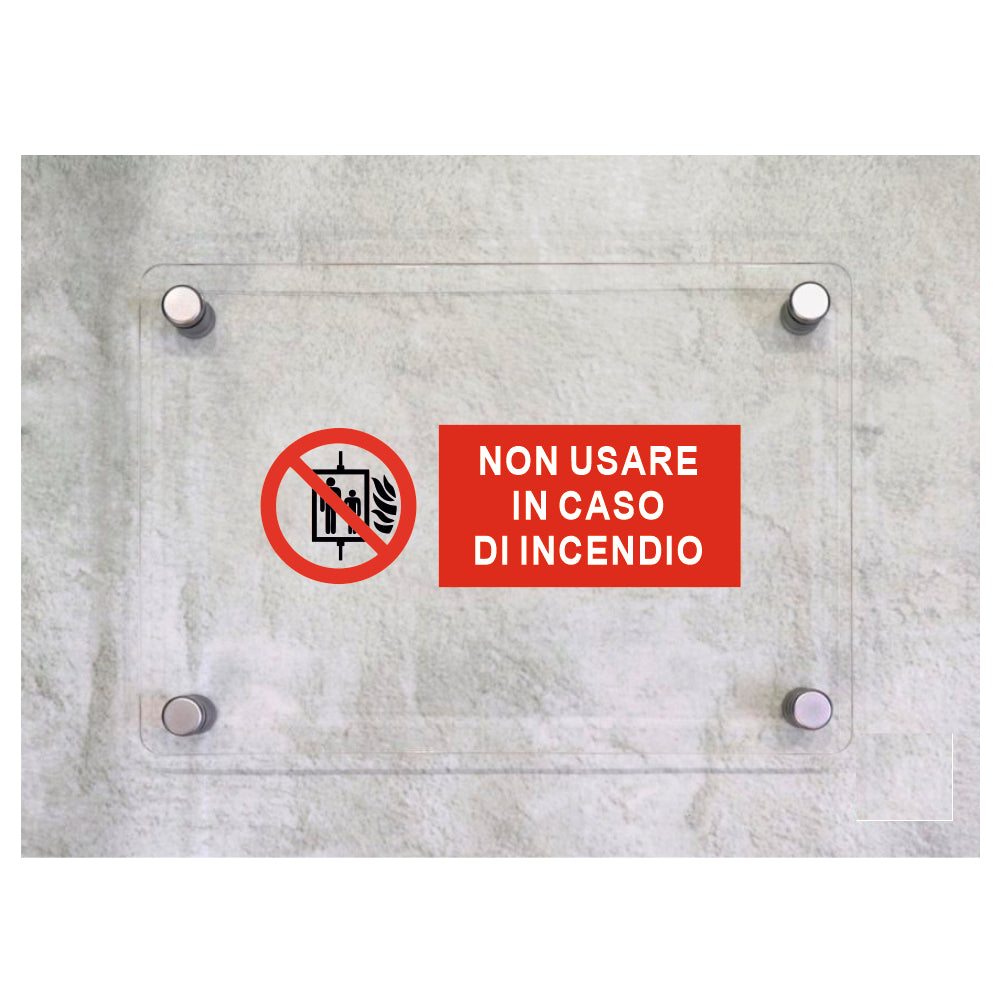 Global Targa Cartello in plexiglass UNI - NON USARE IN CASO DI INCENDIO ORIZZONTALE - Con Distanziali in acciaio inox, Stampa UV