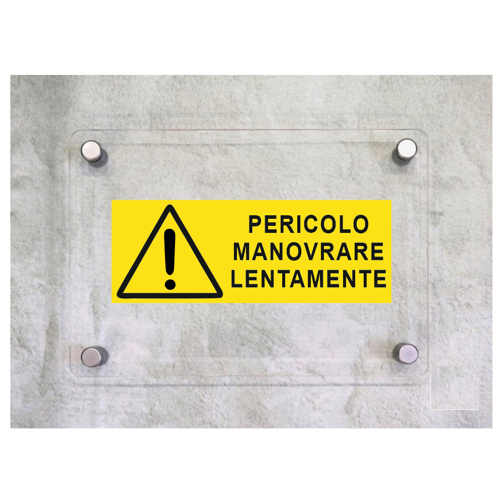 Global Targa Cartello in plexiglass UNI - PERICOLO MANOVRARE LENTAMENTE - Con Distanziali in acciaio inox, Stampa UV