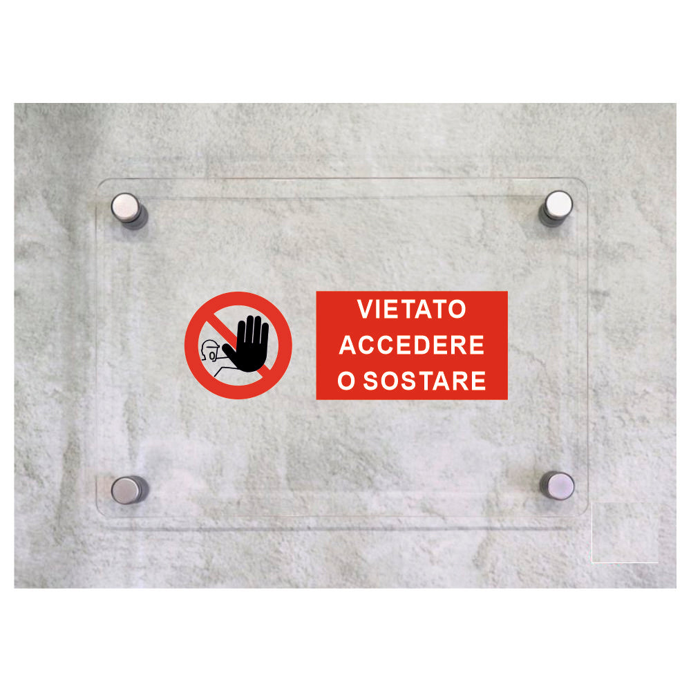 Global Targa Cartello in plexiglass UNI - VIETATO ACCEDERE O SOSTARE ORIZZONTALE - Con Distanziali in acciaio inox, Stampa UV