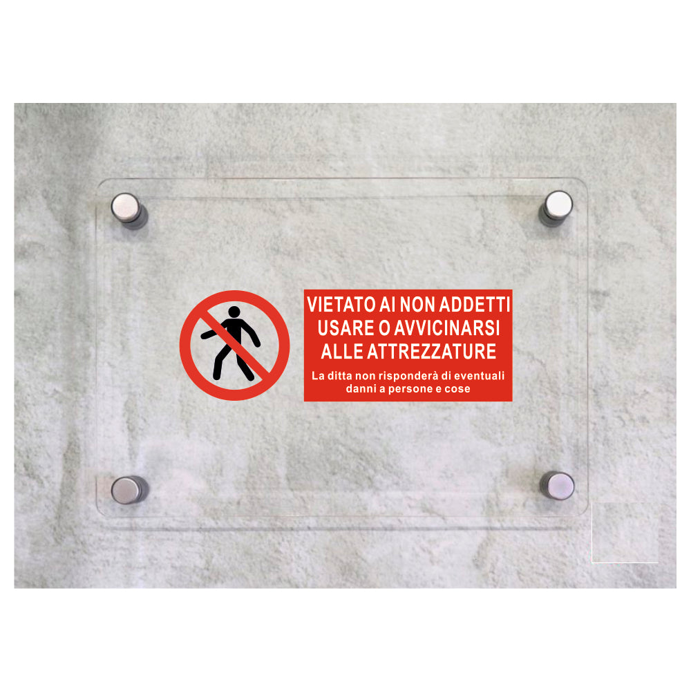 Global Targa Cartello in plexiglass UNI - VIETATO AI NON ADDETTI USARE O AVVICINARSI ALLE ATTREZZATURE ORIZZONTALE - Con Distanziali in acciaio inox, Stampa UV