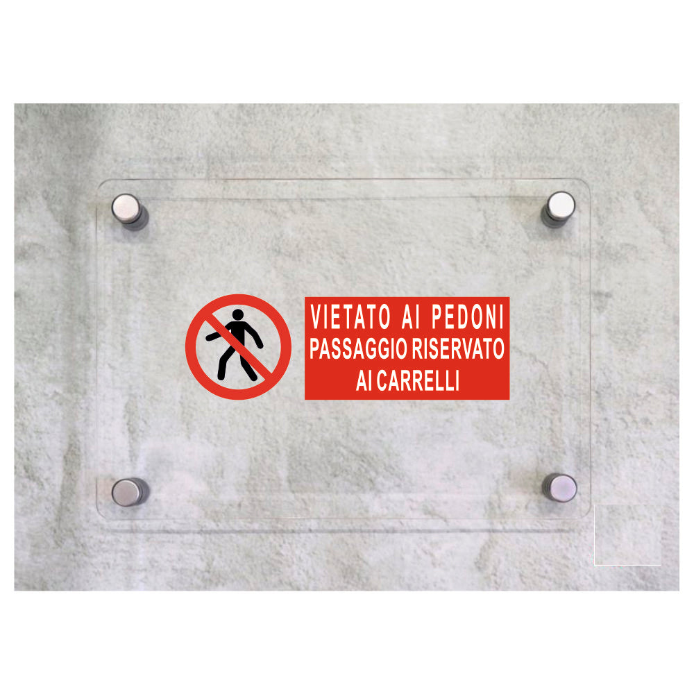 Global Targa Cartello in plexiglass UNI - VIETATO AI PEDONI PASSAGGIO RISERVATO AI CARRELLI - Con Distanziali in acciaio inox, Stampa UV
