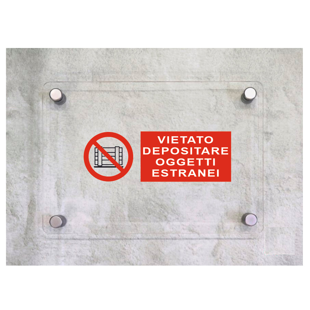 Global Targa Cartello in plexiglass UNI - VIETATO DEPOSITARE OGGETTI ESTRANEI ORIZZONTALE - Con Distanziali in acciaio inox, Stampa UV