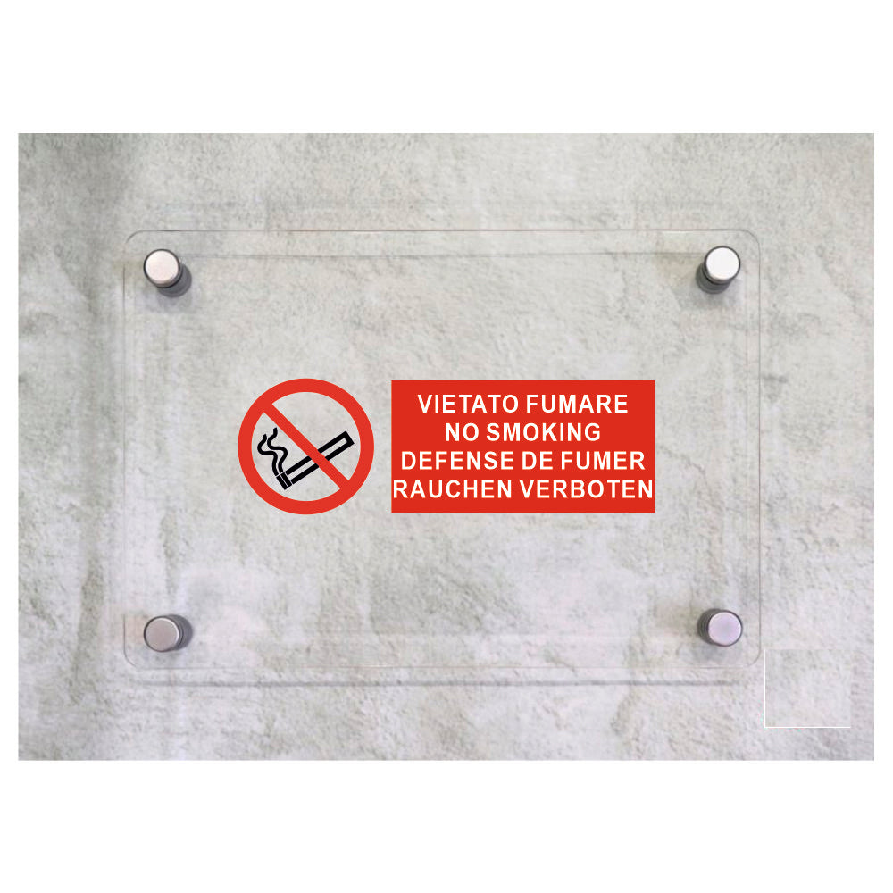 Global Targa Cartello in plexiglass UNI - VIETATO FUMARE - 4 lingue - Con Distanziali in acciaio inox, Stampa UV