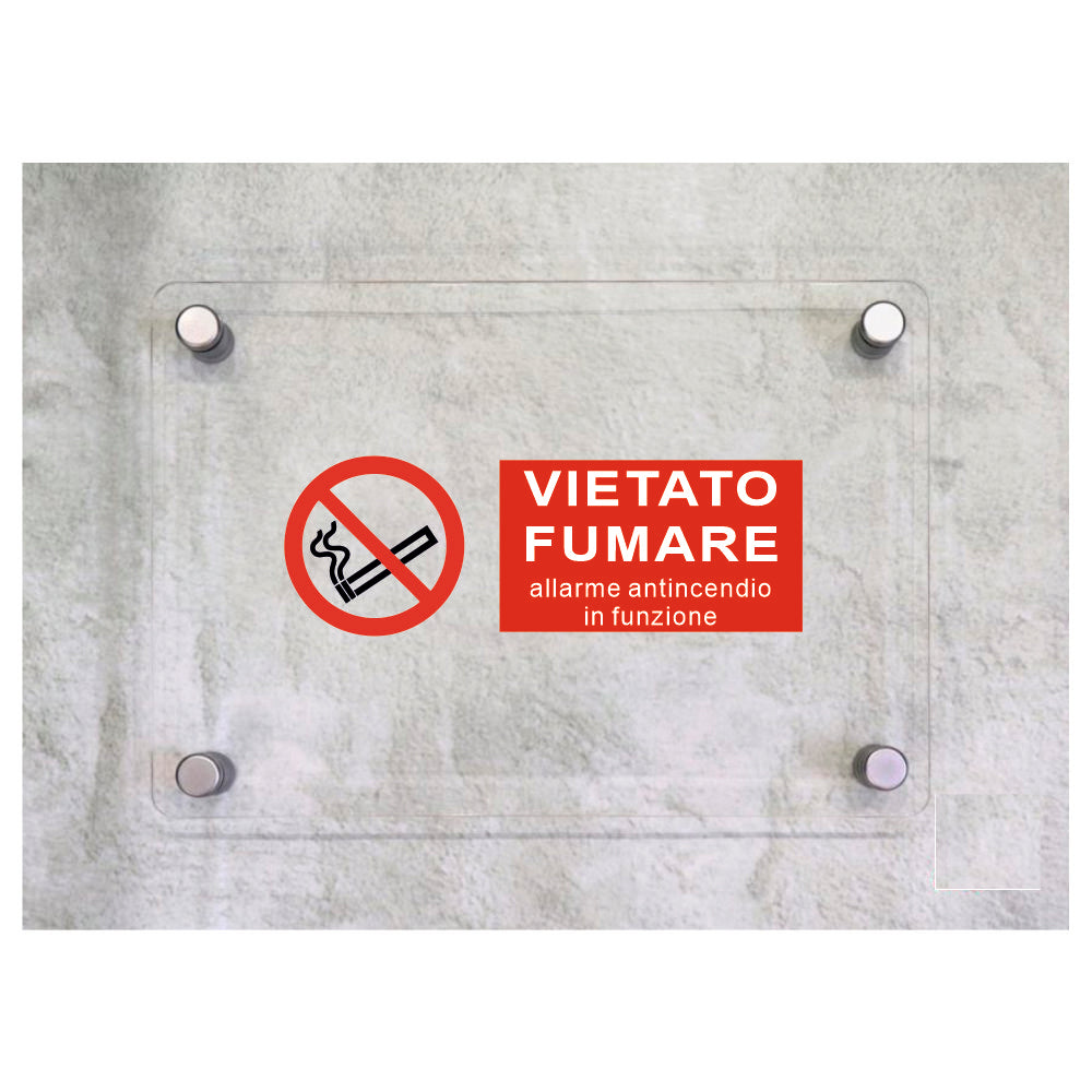 Global Targa Cartello in plexiglass UNI - VIETATO FUMARE - ALLARME ANTINCENDIO IN FUNZIONE - Con Distanziali in acciaio inox, Stampa UV