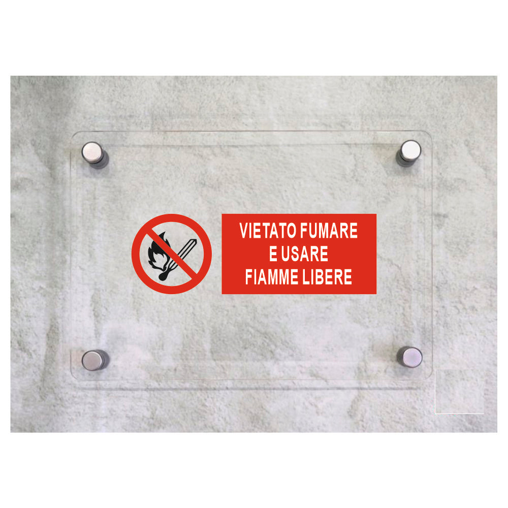 Global Targa Cartello in plexiglass UNI - VIETATO FUMARE E USARE FIAMME LIBERE - Con Distanziali in acciaio inox, Stampa UV