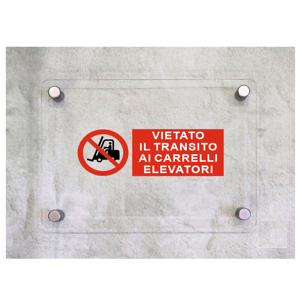 Global Targa Cartello in plexiglass UNI - VIETATO IL TRANSITO AI CARRELLI ELEVATORI ORIZZONTALE - Con Distanziali in acciaio inox, Stampa UV