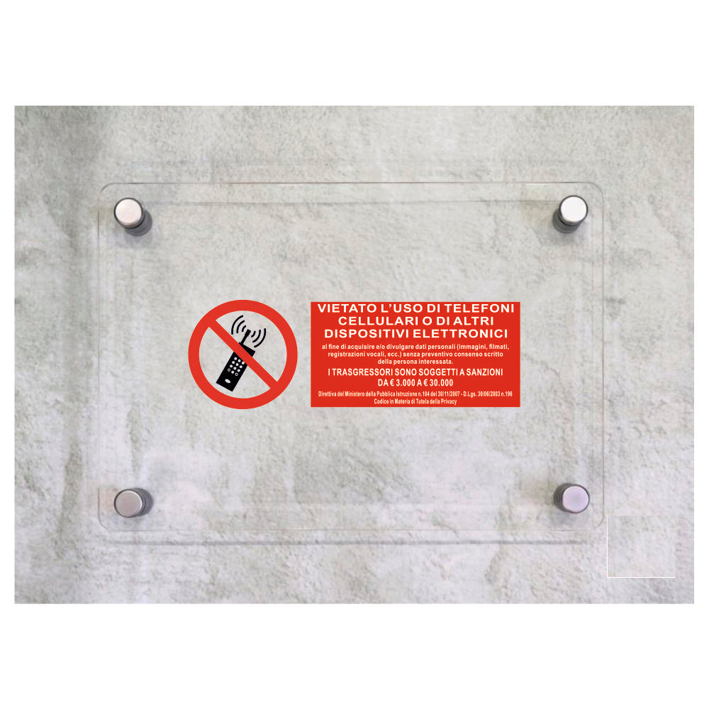 Global Targa Cartello in plexiglass UNI - VIETATO L'USO DI TELEFONI CELLULARI O DI ALTRI DISPOSITIVI ELETTRONICI - Con Distanziali in acciaio inox, Stampa UV