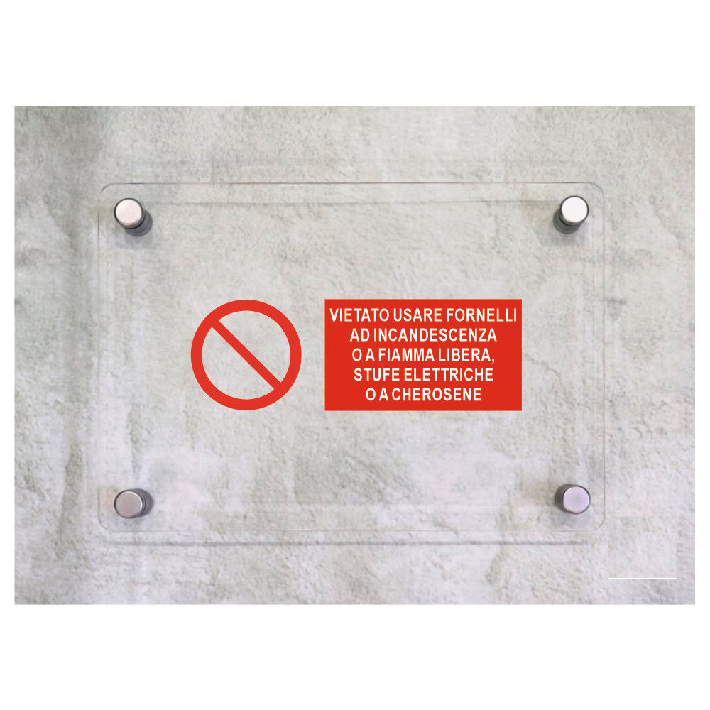 Global Targa Cartello in plexiglass UNI - VIETATO USARE FORNELLI AD INCANDESCENZA ORIZZONTALE - Con Distanziali in acciaio inox, Stampa UV