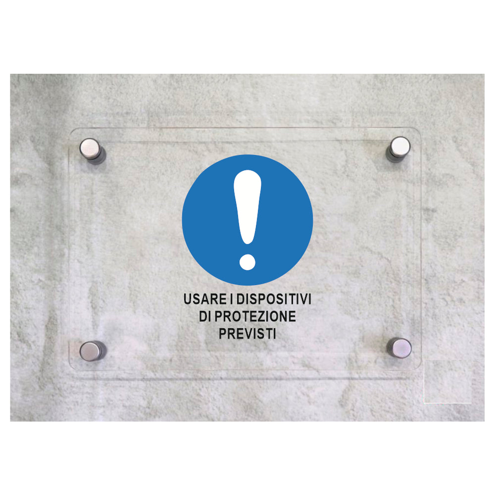 Global Targa Cartello in plexiglass - USARE I DISPOSITIVI DI PROTEZIONE PREVISTI - Con Distanziali in acciaio inox, Stampa UV.