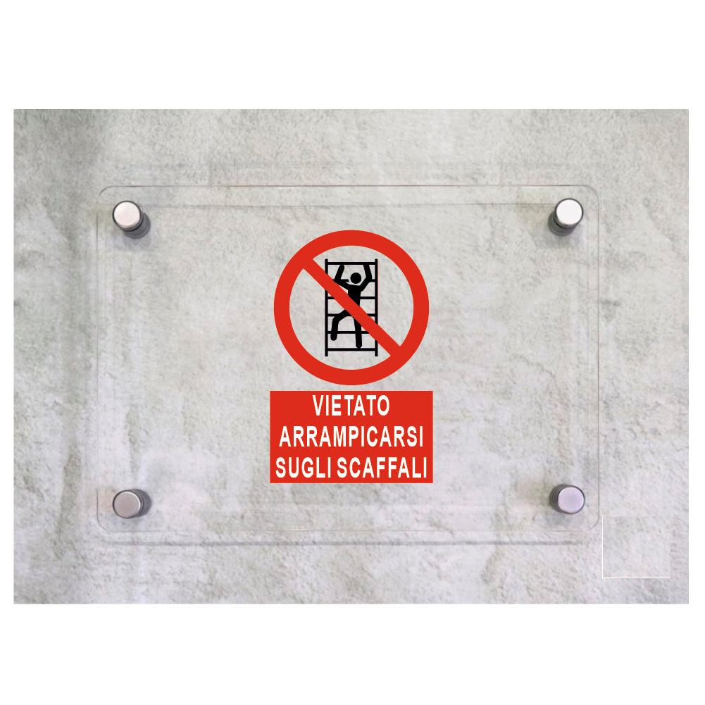 Global Targa Cartello in plexiglass - VIETATO ARRAMPICARSI SUGLI SCAFFALI VERTICALE - Con Distanziali in acciaio inox, Stampa UV