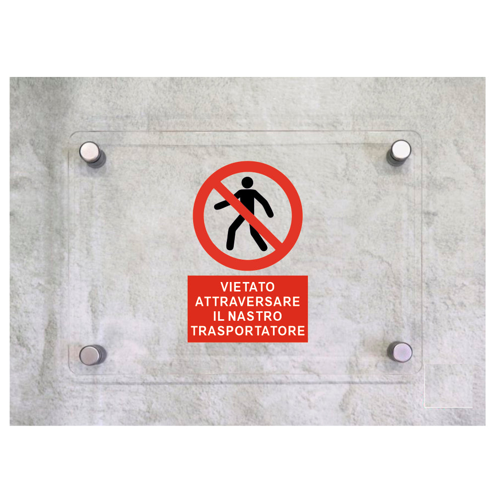 Global Targa Cartello in plexiglass - VIETATO ATTRAVERSARE IL NASTRO TRASPORTATORE VERTICALE - Con Distanziali in acciaio inox, Stampa UV