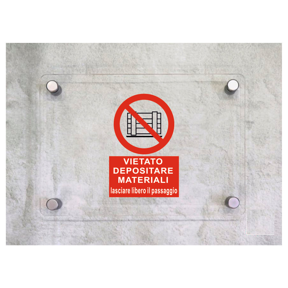 Global Targa Cartello in plexiglass - VIETATO DEPOSITARE MATERIALI LASCIARE LIBERO IL PASSAGGIO VERTICALE - Con Distanziali in acciaio inox, Stampa UV