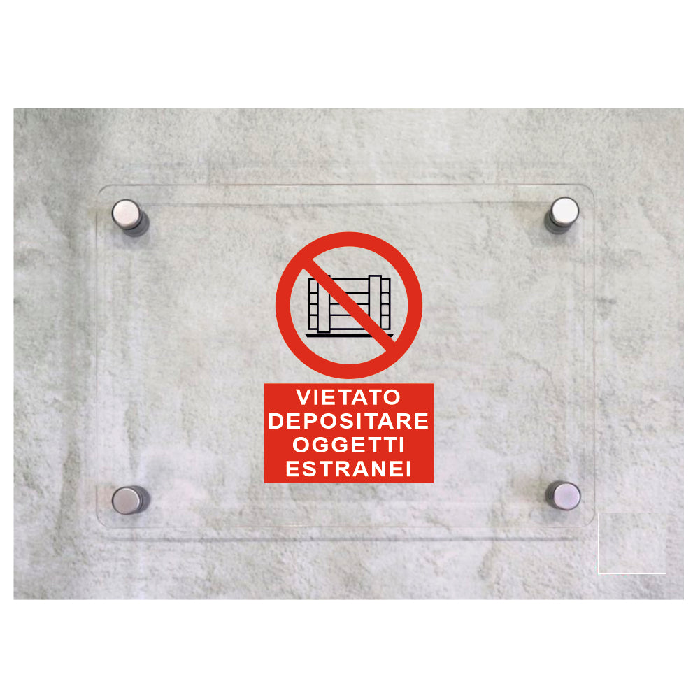 Global Targa Cartello in plexiglass - VIETATO DEPOSITARE OGGETTI ESTRANEI VERTICALE - Con Distanziali in acciaio inox, Stampa UV