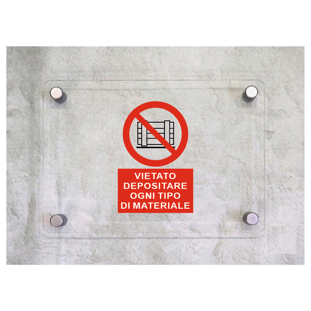 Global Targa Cartello in plexiglass - VIETATO DEPOSITARE OGNI TIPO DI MATERIALE VERTICALE - Con Distanziali in acciaio inox, Stampa UV