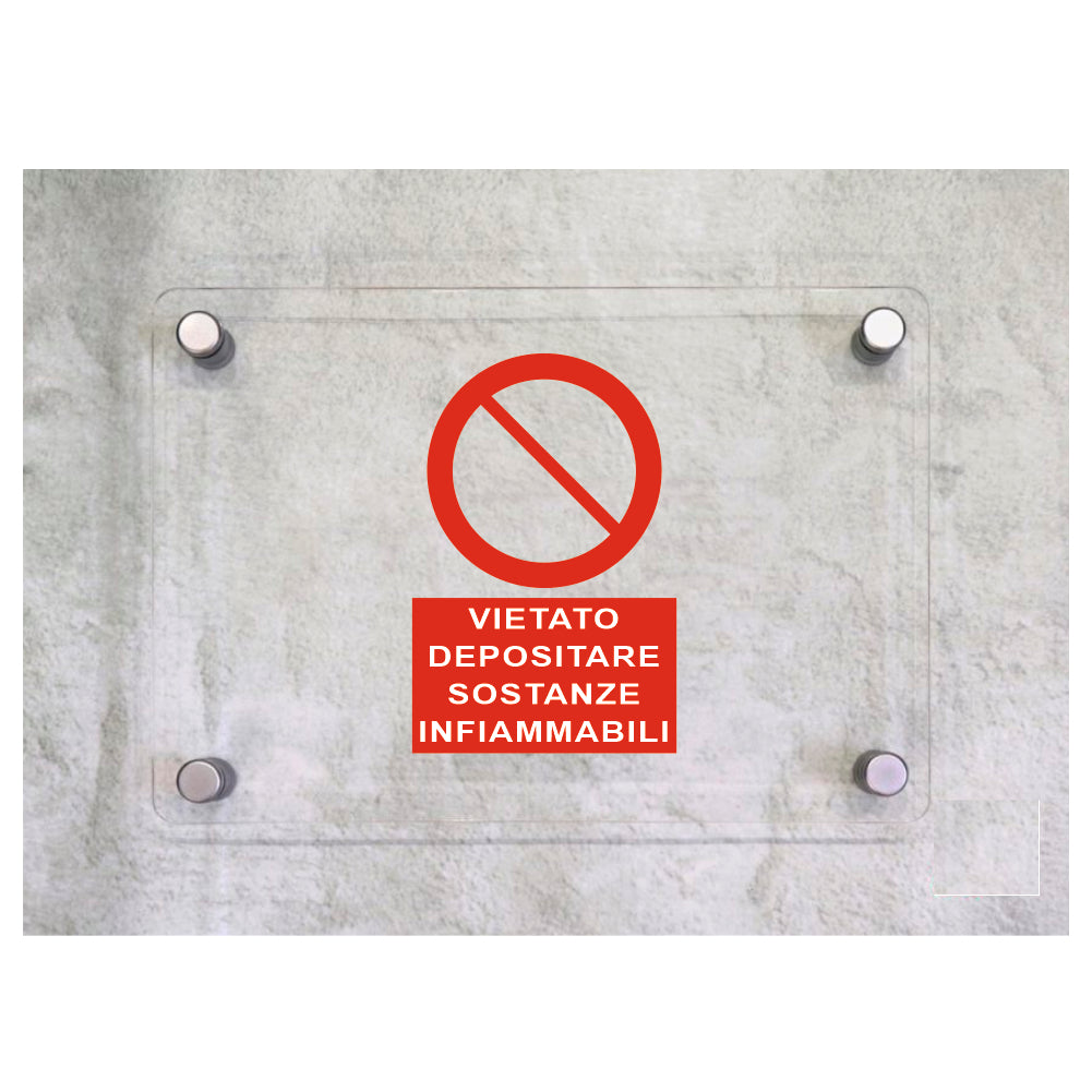 Global Targa Cartello in plexiglass - VIETATO DEPOSITARE SOSTANZE INFIAMMABILI VERTICALE - Con Distanziali in acciaio inox, Stampa UV