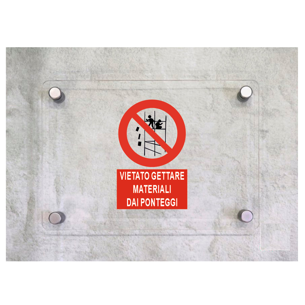Global Targa Cartello in plexiglass - VIETATO GETTARE MATERIALI DAI PONTEGGI VERTICALE - Con Distanziali in acciaio inox, Stampa UV