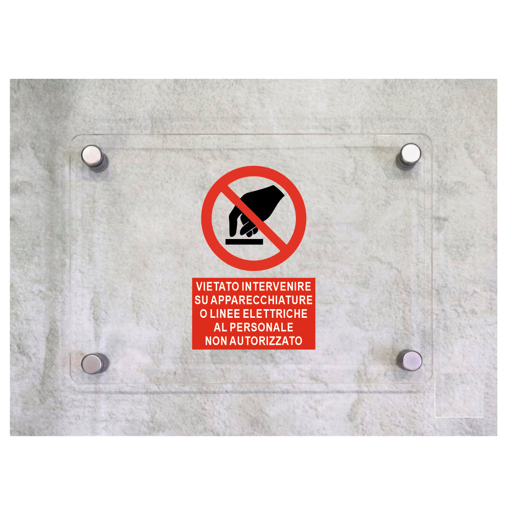 Global Targa Cartello in plexiglass - VIETATO INTERVENIRE SU APPARECCHIATURE O LINEE ELETTRICHE VERTICALE - Con Distanziali in acciaio inox, Stampa UV