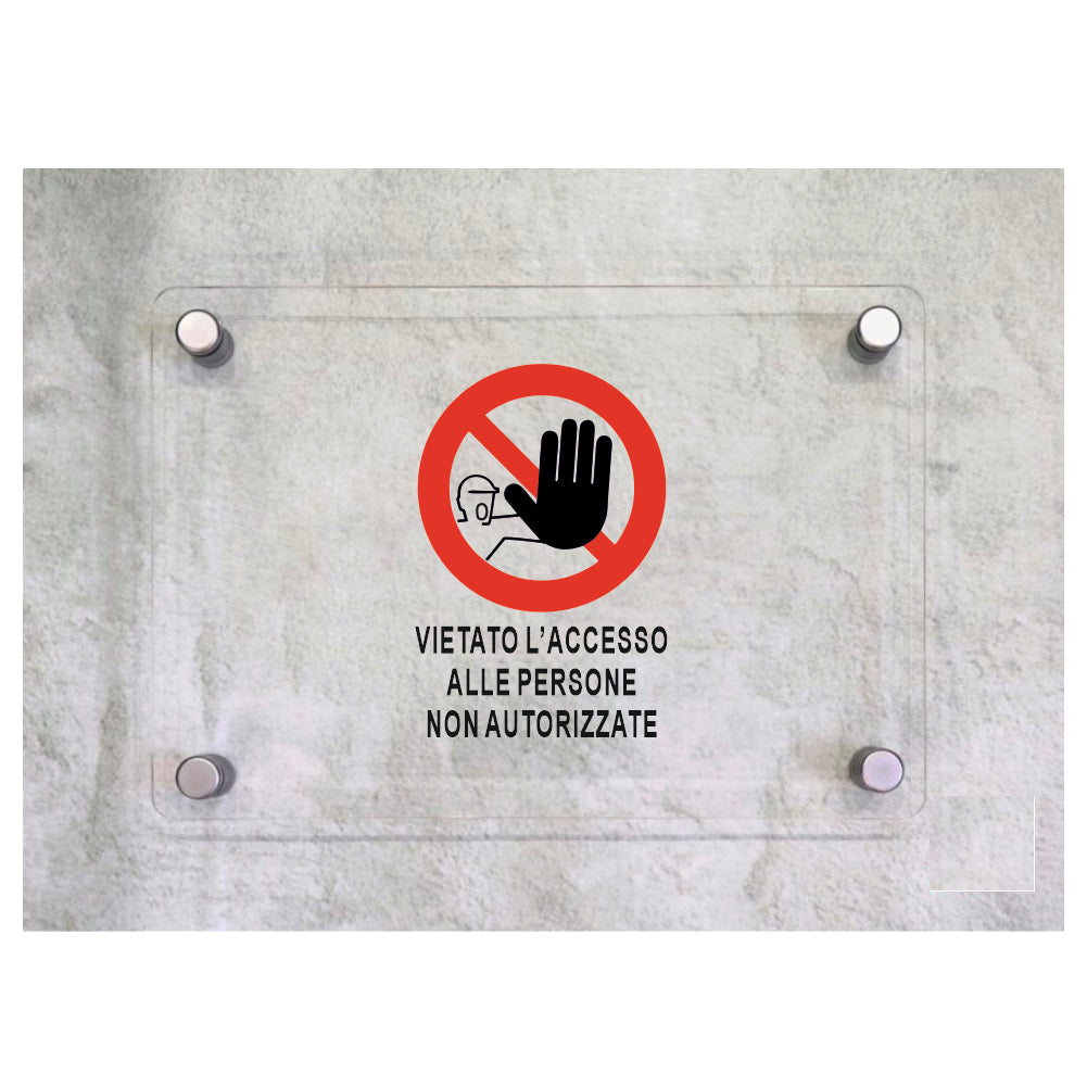 Global Targa Cartello in plexiglass - VIETATO L'ACCESSO ALLE PERSONE NON AUTORIZZATE MOD2 VERTICALE - Con Distanziali in acciaio inox, Stampa UV
