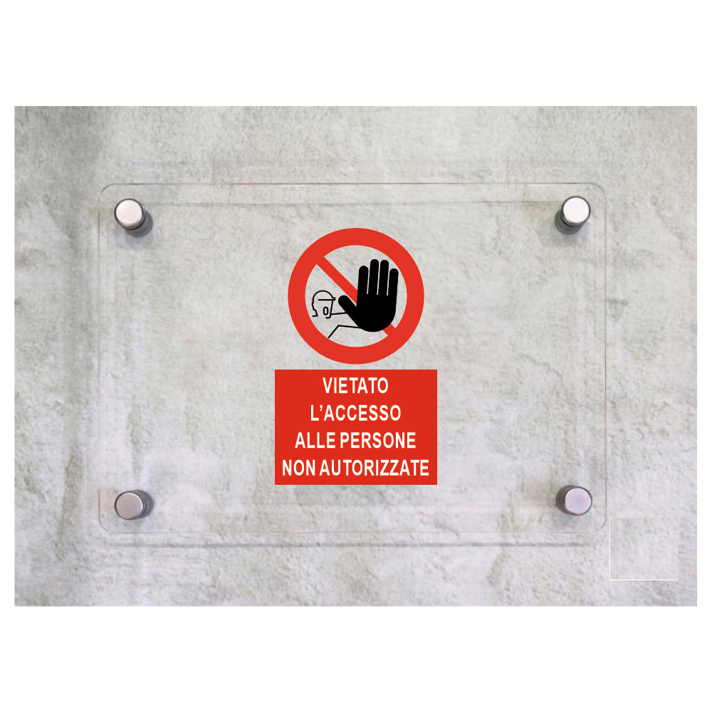 Global Targa Cartello in plexiglass - VIETATO L'ACCESSO ALLE PERSONE NON AUTORIZZATE VERTICALE - Con Distanziali in acciaio inox, Stampa UV
