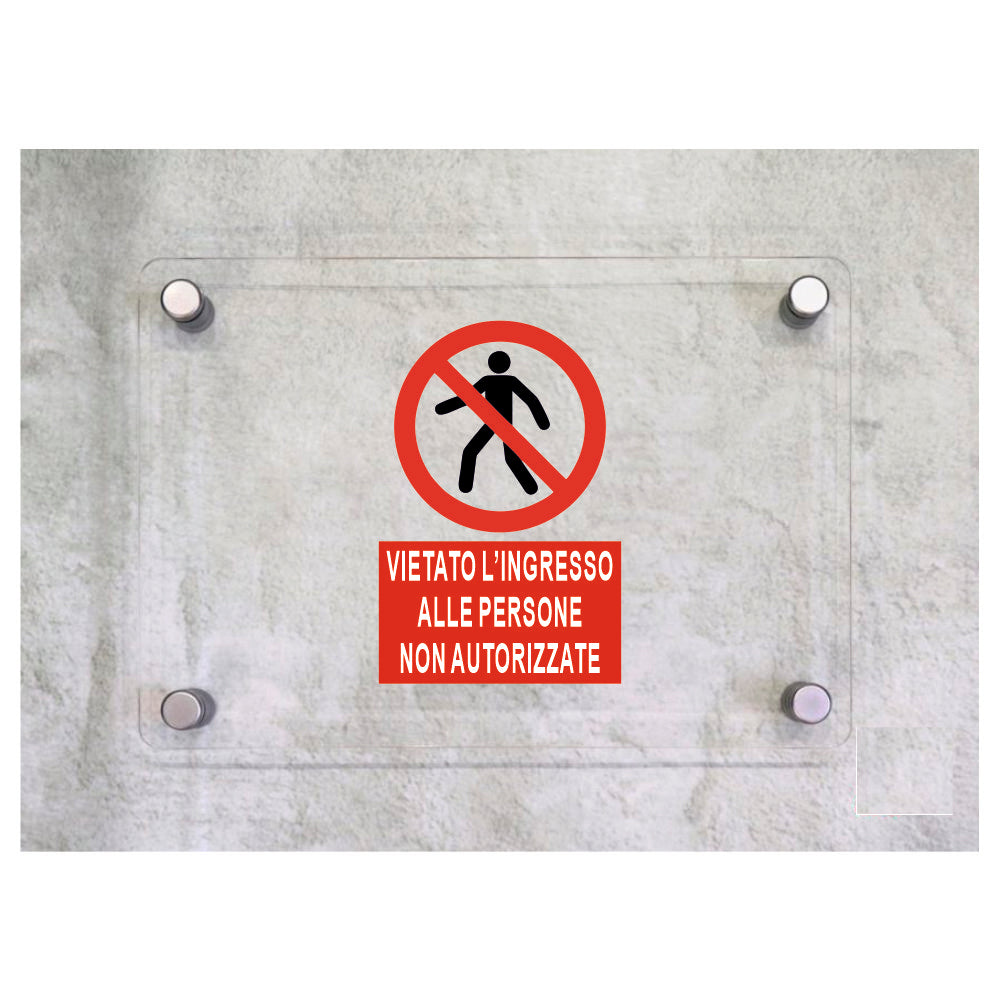 Global Targa Cartello in plexiglass - VIETATO L'INGRESSO ALLE PERSONE NON AUTORIZZATE VERTICALE - Con Distanziali in acciaio inox, Stampa UV