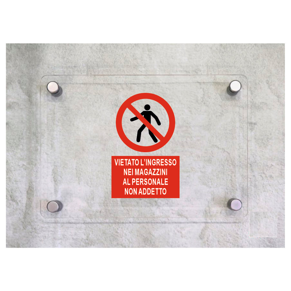 Global Targa Cartello in plexiglass - VIETATO L'INGRESSO NEI MAGAZZINI AL PERSONALE NON ADDETTO VERTICALE - Con Distanziali in acciaio inox, Stampa UV