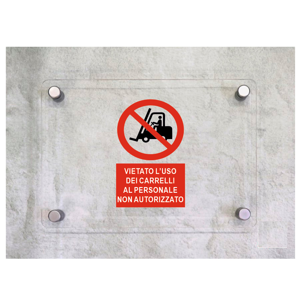 Global Targa Cartello in plexiglass - VIETATO L'USO DEI CARRELLI AL PERSONALE NON AUTORIZZATO VERTICALE - Con Distanziali in acciaio inox, Stampa UV