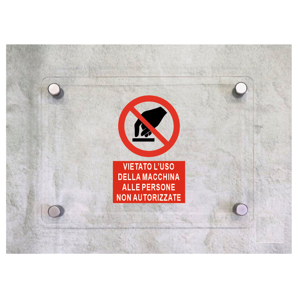 Global Targa Cartello in plexiglass - VIETATO L'USO DELLA MACCHINA ALLE PERSONE NON AUTORIZZATE VERTICALE - Con Distanziali in acciaio inox, Stampa UV