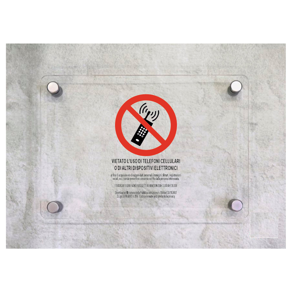 Global Targa Cartello in plexiglass - VIETATO L'USO DI TELEFONI CELLULARI O DI ALTRI DISPOSITIVI ELETTRONICI VERTICALE - Con Distanziali in acciaio inox, Stampa UV