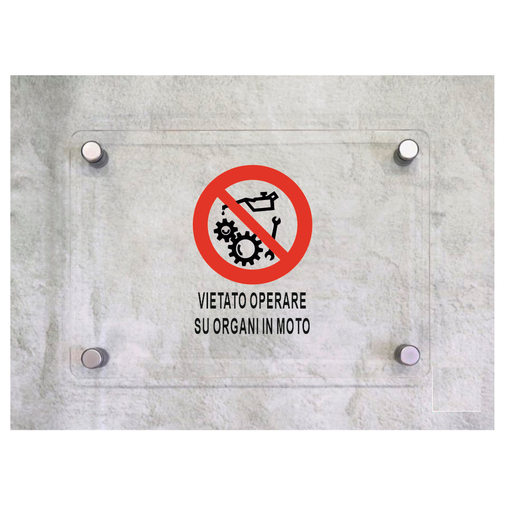 Global Targa Cartello in plexiglass - VIETATO OPERARE SU ORGANI IN MOTO MOD2 VERTICALE - Con Distanziali in acciaio inox, Stampa UV