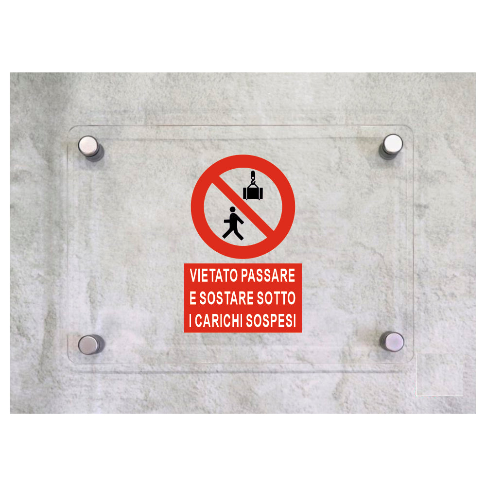 Global Targa Cartello in plexiglass - VIETATO PASSARE E SOSTARE SOTTO I CARICHI SOSPESI VERTICALE - Con Distanziali in acciaio inox, Stampa UV