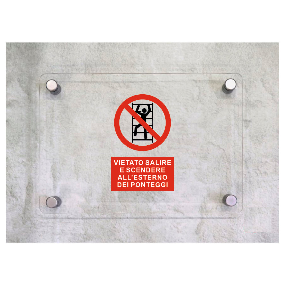 Global Targa Cartello in plexiglass - VIETATO SALIRE E SCENDERE ALL'ESTERNO DEI PONTEGGI VERTICALE - Con Distanziali in acciaio inox, Stampa UV