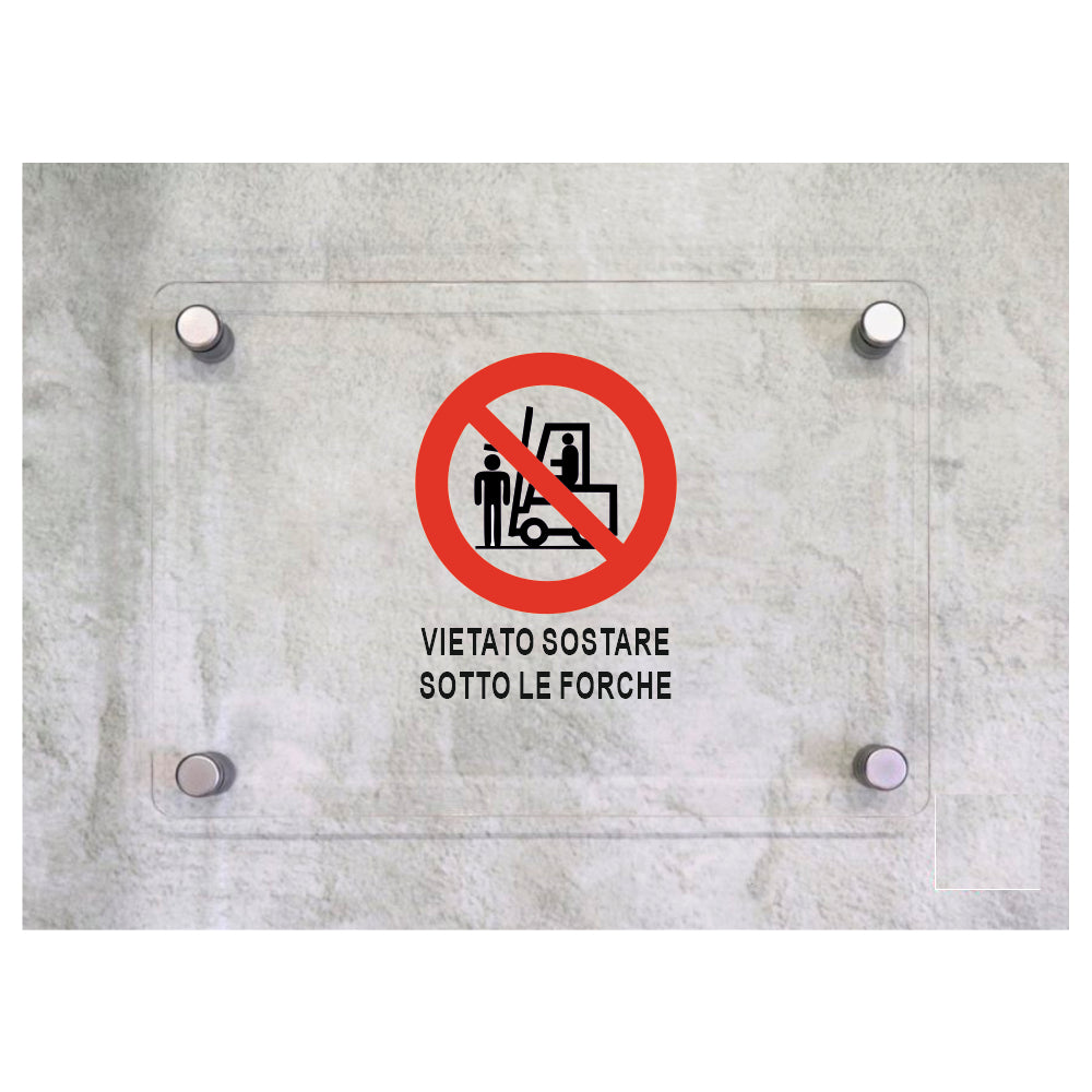 Global Targa Cartello in plexiglass - VIETATO SOSTARE SOTTO LE FORCHE VERTICALE - Con Distanziali in acciaio inox, Stampa UV