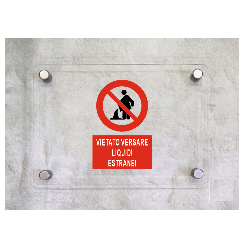 Global Targa Cartello in plexiglass - VIETATO VERSARE LIQUIDI ESTRANEI VERTICALE - Con Distanziali in acciaio inox, Stampa UV