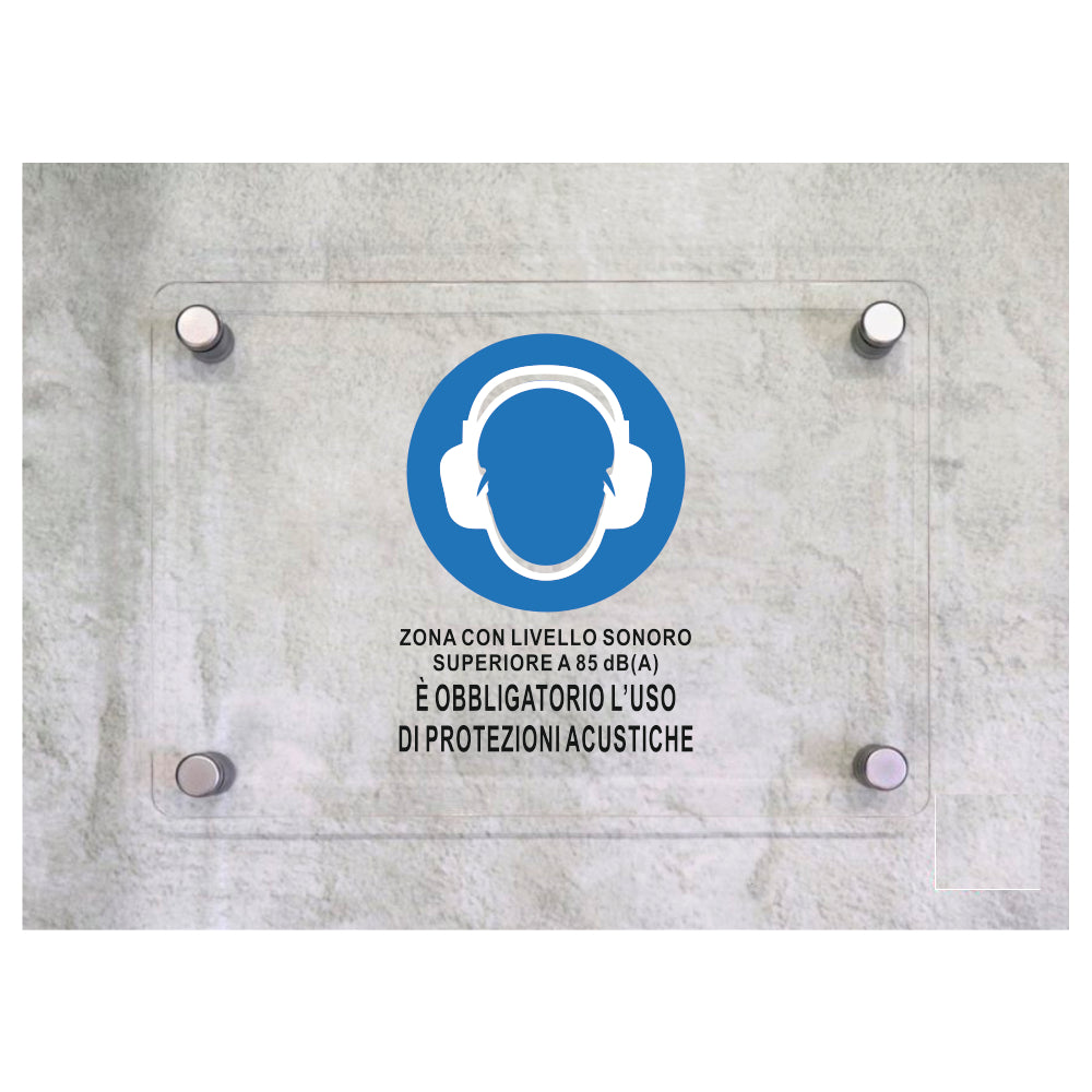 Global Targa Cartello in plexiglass - ZONA CON LIVELLO SONORO SUPERIORE A 85 Dba - Con Distanziali in acciaio inox, Stampa UV.
