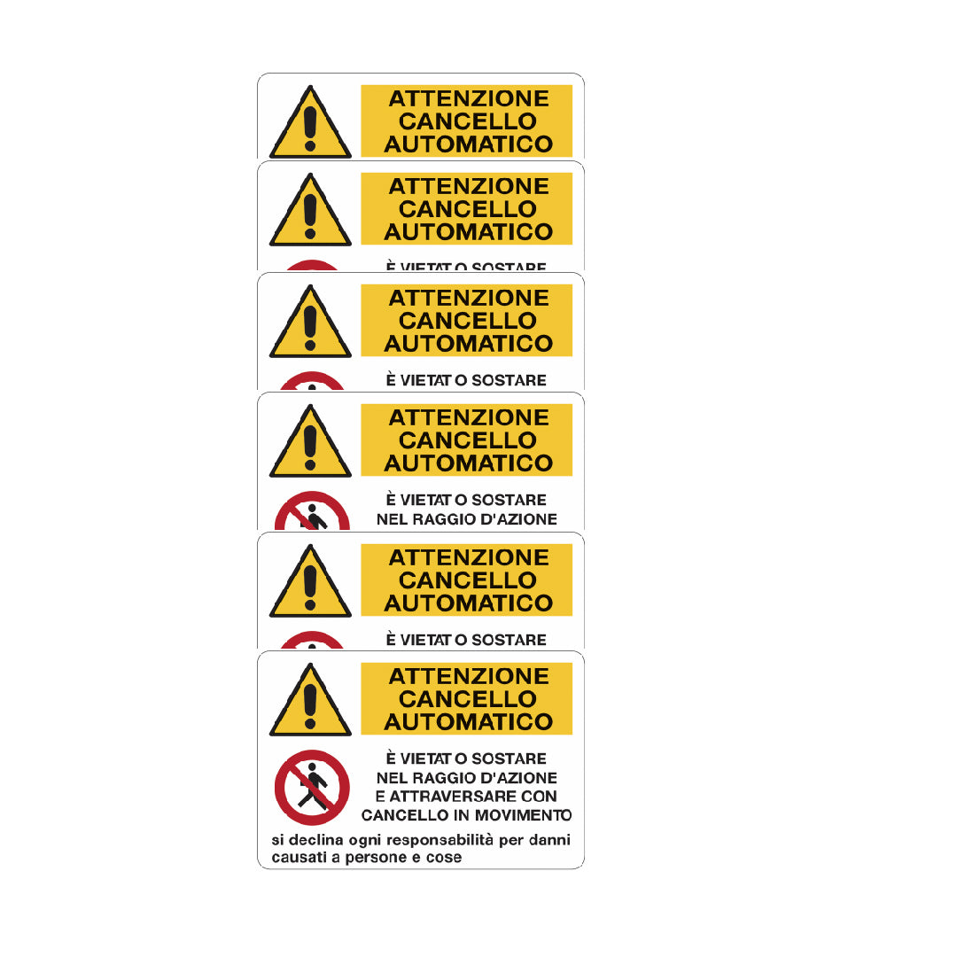 KIT DI 6 ADESIVI -Cartelli di divieto e pericolo - Attenzione cancello automatico- Pittogramma ISO 7010 Con Stampa Diretta U.V. (IDEALE ANCHE PER ESTERNO)