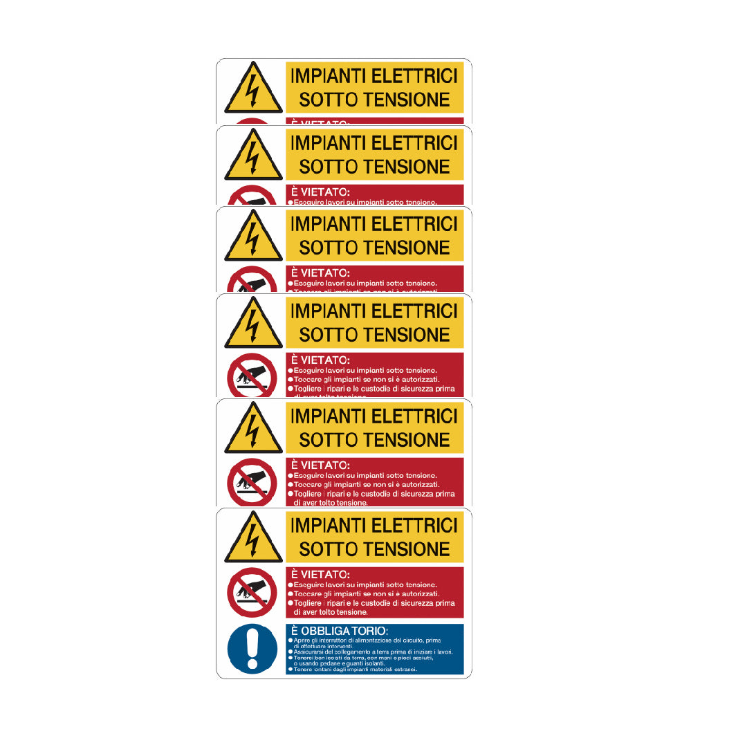 KIT DI 6 ADESIVI -Impianti elettrici sotto tensione- Pittogramma ISO 7010 Con Stampa Diretta U.V. (IDEALE ANCHE PER ESTERNO)
