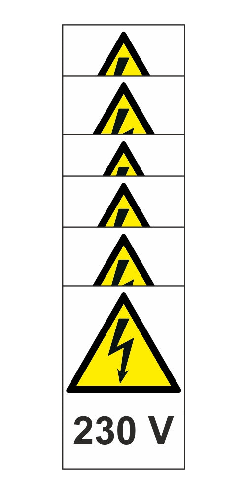 KIT DI 6 ADESIVI RETTANGOLARI - 230 volt - Pittogramma ISO 7010 Con Stampa Diretta U.V. (IDEALE ANCHE PER ESTERNO)