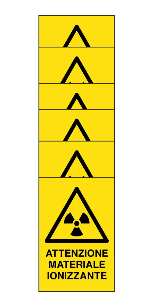 KIT DI 6 ADESIVI RETTANGOLARI - attenzione materiale ionizzante - Pittogramma ISO 7010 Con Stampa Diretta U.V. (IDEALE ANCHE PER ESTERNO)