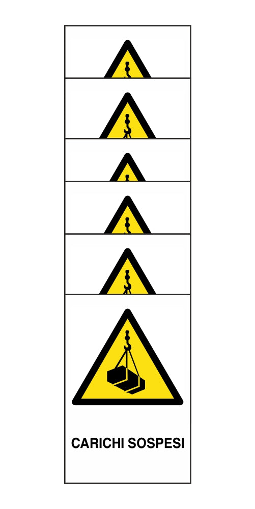 KIT DI 6 ADESIVI RETTANGOLARI - carichi sospesi - Pittogramma ISO 7010 Con Stampa Diretta U.V. (IDEALE ANCHE PER ESTERNO)