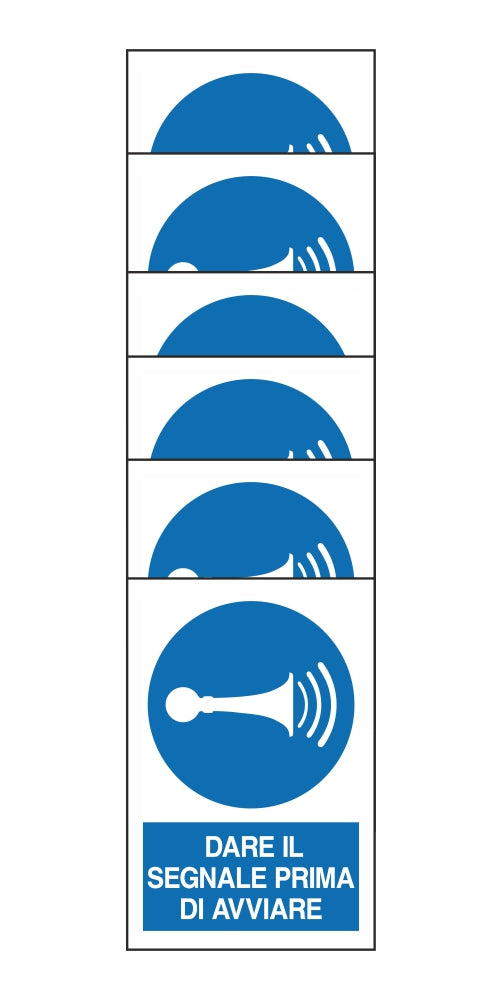 KIT DI 6 ADESIVI RETTANGOLARI - DARE IL SEGNALE PRIMA DI AVVIARE - Pittogramma ISO 7010 Con Stampa Diretta U.V. (IDEALE ANCHE PER ESTERNO)